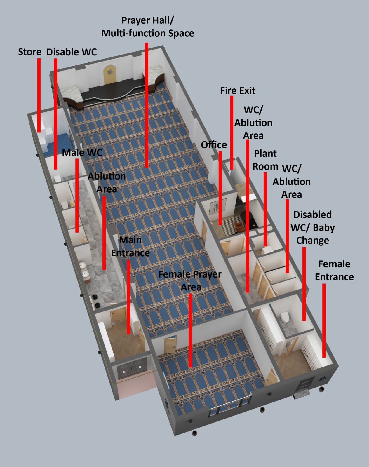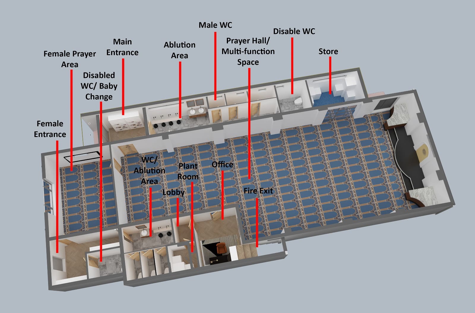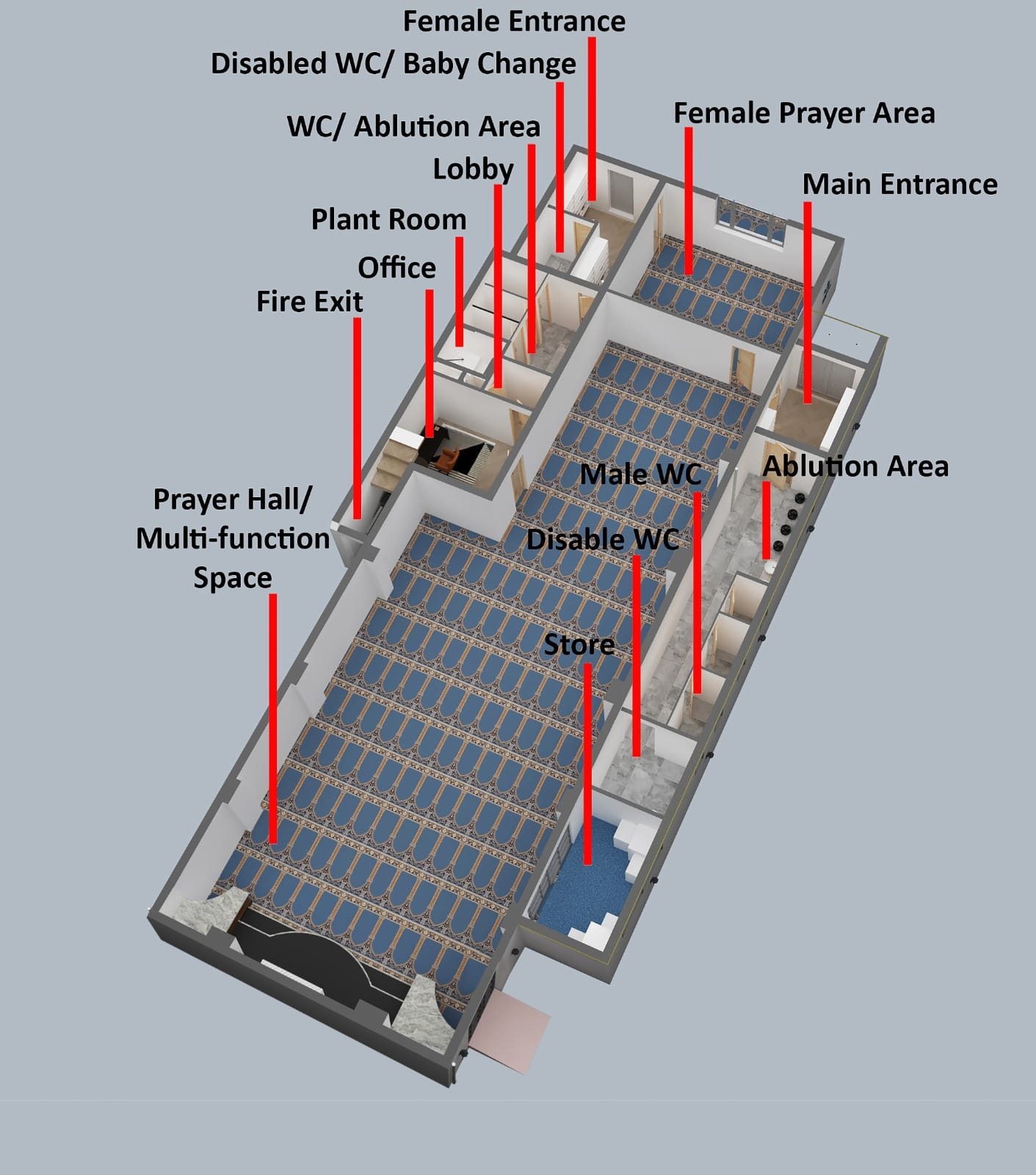 We developed design proposals that included extending the wudu facilities and reconfiguring sections of the ground floor layout to eliminate bottlenecks during busy prayer times. High-quality 3D renders were produced to help visualise the design and communicate the improvements clearly. The scheme was then prepared and submitted for planning approval with Manchester City Council.