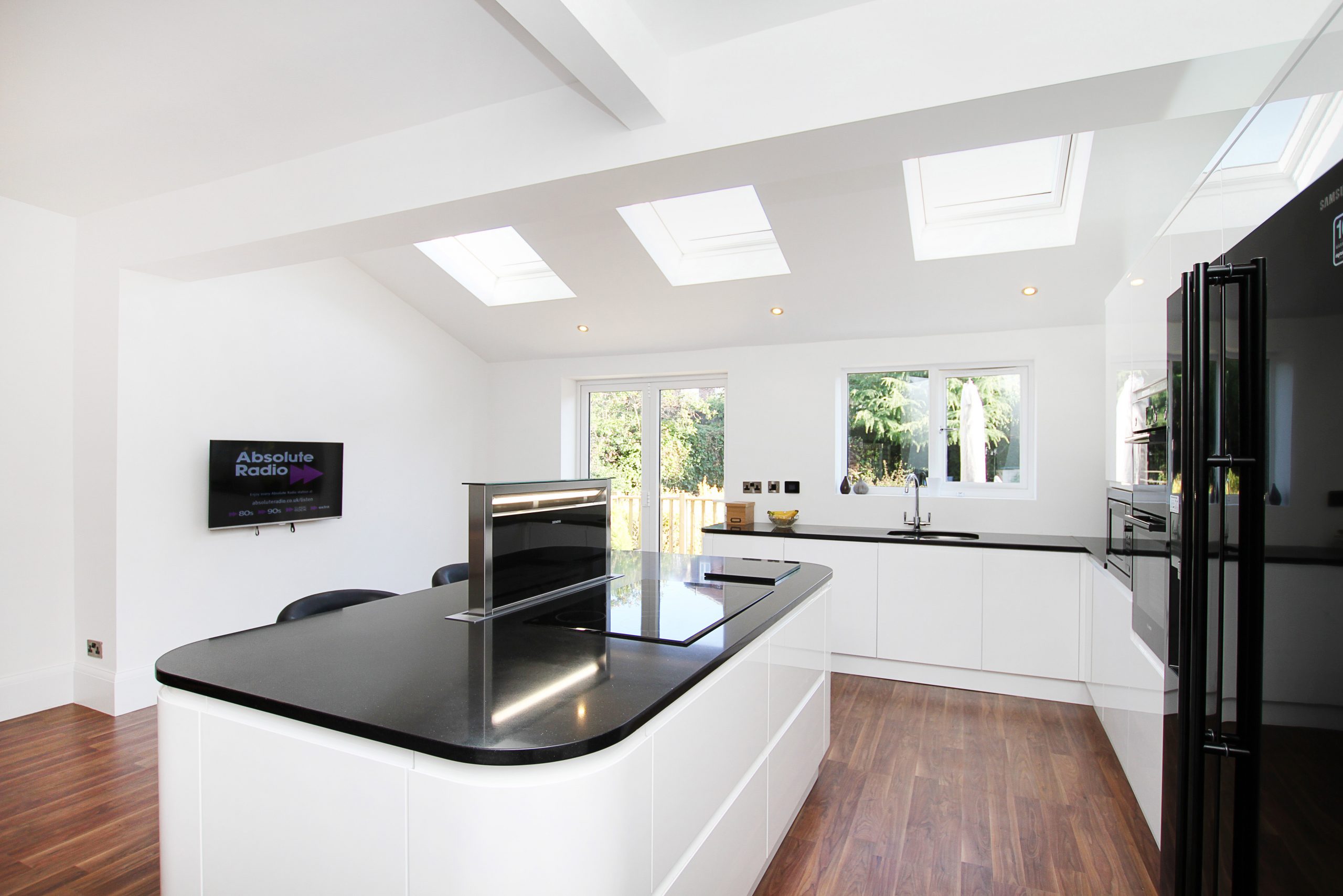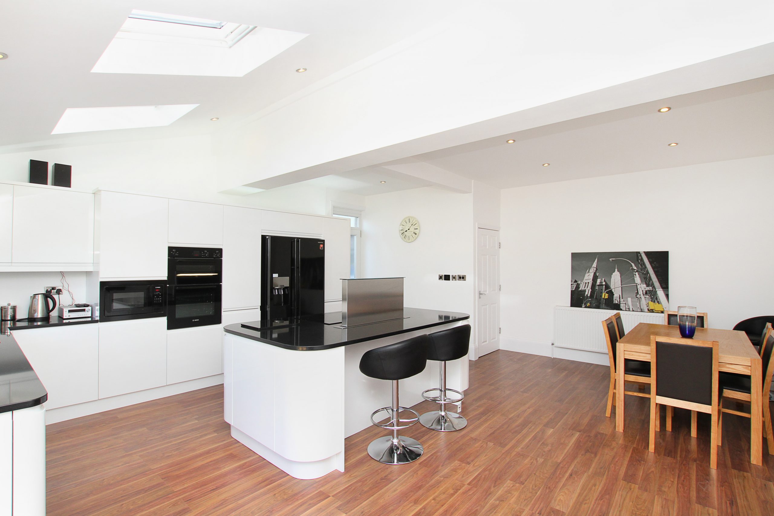 We opened up the existing rear of the home, removing internal walls to create a unified space. A new extension was designed with a vaulted ceiling and multiple skylights to maximise daylight. Detailed drawings and structural coordination ensured the new volume blended seamlessly with the original property.